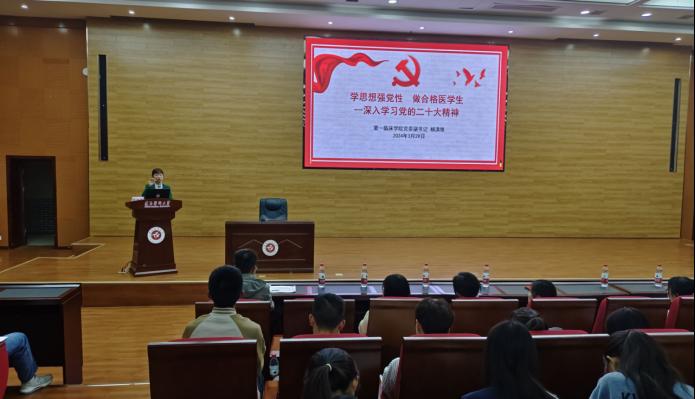 为深入学习习近平新时代中国特色社会主义思想,进一步提升支部师生党员的党性修养,教育青年员工在新征程上立志做有理想、敢担当、能吃苦、肯奋斗的新时代好青年,2024年3月29日晚19:00,第一临床公司党委副书记杨洪艳以“学思想强党性 做合格医员工--深入学习党的二十大精神”为主题讲授专题党课。本次党课在新浦校区道德讲堂进行,永利yl23411本科生第二党支部所有师生党员参与学习。