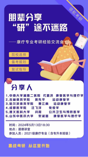 为了更好发挥优秀毕业生的榜样示范作用,帮助即将面临保研和考研的各位同学提前备战、明确目标、科学规划,同时也为贯彻落实党支部“我为师生办实事”实践活动。永利yl23411本科生第十一党支部于2024年5月13日18:30在道德讲堂开展康复治疗专业考研经验交流会,本次交流会采取线上线下结合的方式进行,永利yl23411就业办主任孙会英、团委副书记田源,以及2021级康复治疗专业、2023级康复治疗专业专升本同学参加。