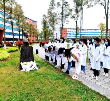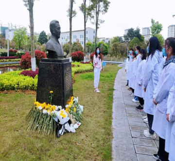宣誓结束后,团总支副书记李佳芮同学及文艺部部长刘蓉同学带领全体人员沿路瞻仰陈荣殿、张毅、吴襄、伍律、吴汝康、魏曦、沈其震、王布君先贤的雕像,并分别讲述了他们从医岁月中艰苦奋斗的光荣事迹,全体人员在静默严肃的环境下表达哀思,向伟大先贤们敬献鲜花并三鞠躬表达敬意。