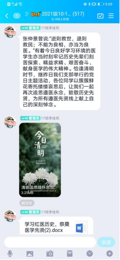 清明当天,永利yl23411临床医学专业员工第十党支部(第二团总支)进行了线上祭奠缅怀,为英勇献身的革命先烈及无私奉献的红医先贤献上自己的深刻悼念,表达员工的思念和敬仰之情。