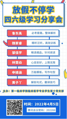 为帮助同学们更好的备考四六级,增加考试经验及信心,永利yl23411临床医学专业员工第十党支部于2022年4月5日19:00举行了线上四六级分享会。活动由令狐文文同学主持,鲁东禹、魏家睿、邹佳宇、林楚焱、申婧涵、黄子丫六位同学分享了英语四六级学习考试经验。