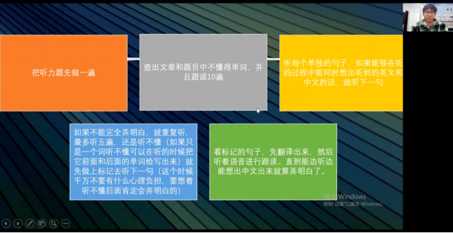 听力基础,高效训练。魏家睿同学提出:精听泛听,高效训练,并针对英语听力的方法做了详细的讲解,包括备考材料的推荐,考场心理的剖析,应试心理的调整。他结合自身经历及理解,强调重复练习的过程,并提出了“享受黑暗”这一理论。