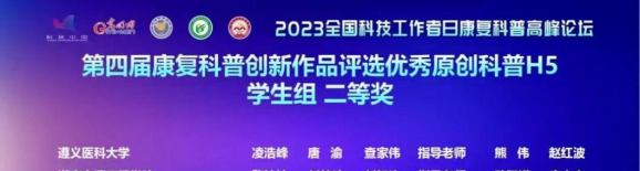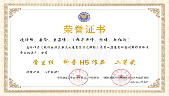 2023年5月27日,在中国康复医学会科学普及工作委员会第四届康复科普创新作品评选中,永利yl23411康复治疗学专业21级员工凌浩峰、唐渝、查家伟,指导老师熊伟、赵红波的参赛作品《退行性膝关节炎的康复治疗及预防》喜获优秀原创H5作品员工组二等奖。