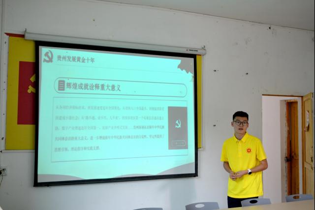 最后,“石榴籽黔行”宣讲队的赵乐驰同学为村干部进行了“铸牢中华民族共同体意识”理论宣讲,他分别从铸牢中华民族共同体意识的缘起及内涵、贵州快速发展的十年、铸牢中华民族共同体意识的意义三方面进行阐述。使中华民族共同体意识入脑入心,进一步增强各族村干部、群众对中华民族的认同感和自豪感,持续铸牢中华民族共同体意识,发扬“石榴籽”精神,浇灌“共同体”之花。