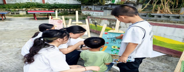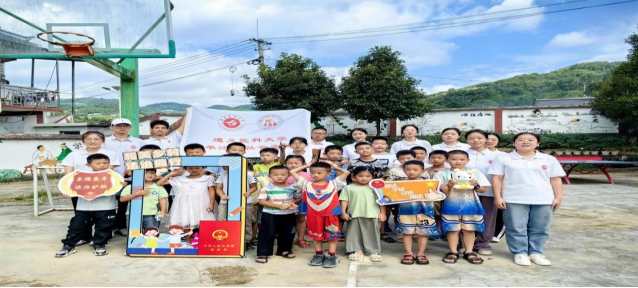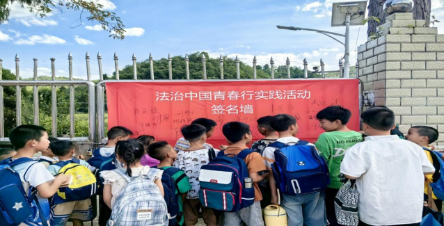 建设乡村法治宣传阵地,夯实群众法治信仰根基。在枫香镇保海村保陇小学,实践队聚焦群众法律援助、生态环境治理、道路交通安全等日常生活领域,绘制乡村法律知识扫码学习文化墙,提高村民法律知识学习的针对性和便捷性。实践队捐赠20余册法律著作书籍和法律文本,建设乡村法治文化图书角,并带领小朋友们参观、互动和学习。实践队聚焦儿童生命健康和财产安全,以绘画、书法、手工粘土、签名墙等为载体,创作防范网络诈骗、青少年权益保护等法治书画作品,进行法治宣传和作品展览,耐心解答小朋友的疑惑和问题,提高乡村小朋友的法治意识和法治能力。夜晚,实践队组织开展“法治夜谈”,有幸邀请到在村小教师岗位默默坚守了20余年的黄文贵老师,他满腔热情地向队员们讲述教育法治事业的发展历程,以及他亲身经历的典型法治案例。队员们认真聆听,不时与黄老师对话交流农村教育事业和乡村法治现状,大家深受启迪,对法治国家、法治社会、法治政府建设尤其是乡村振兴法治建设有了新的认识。
