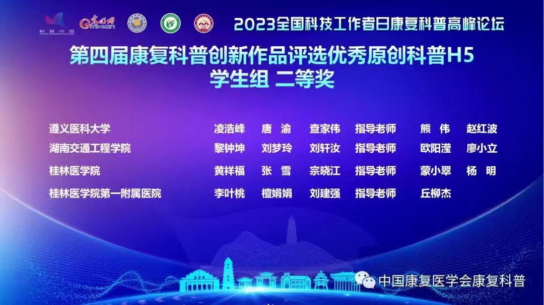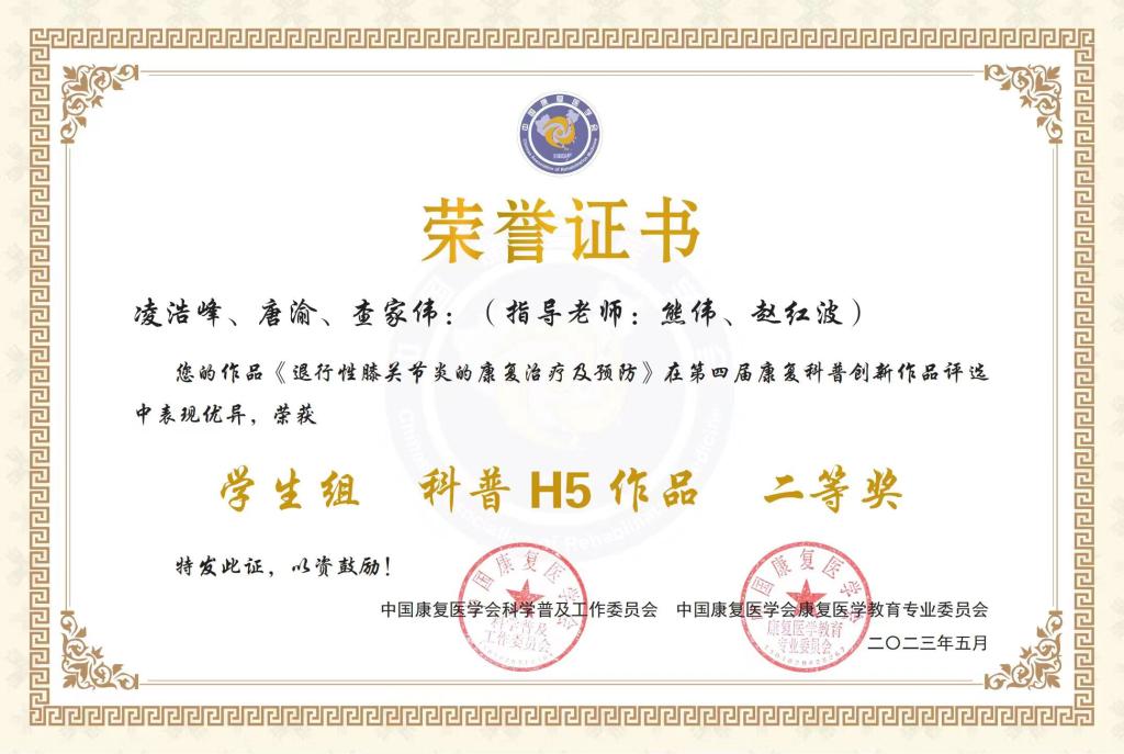 2023年5月27日,在中国康复医学会科学普及工作委员会第四届康复科普创新作品评选中,永利yl23411康复治疗学专业21级员工凌浩峰、唐渝、查家伟,指导老师熊伟、赵红波的参赛作品《退行性膝关节炎的康复治疗及预防》喜获优秀原创H5作品员工组二等奖。通过此次竞赛,使员工提高专业知识和技能水平,培养创新和实践能力,将专业知识与科普宣传相结合,有助于提高员工的综合素质和创新能力。此次参赛并获奖,促进公司康复治疗学专业与兄弟院校专业间的相互交流和学习,扩大专业影响力,对康复治疗学专业的发展与提高具有积极的意义。